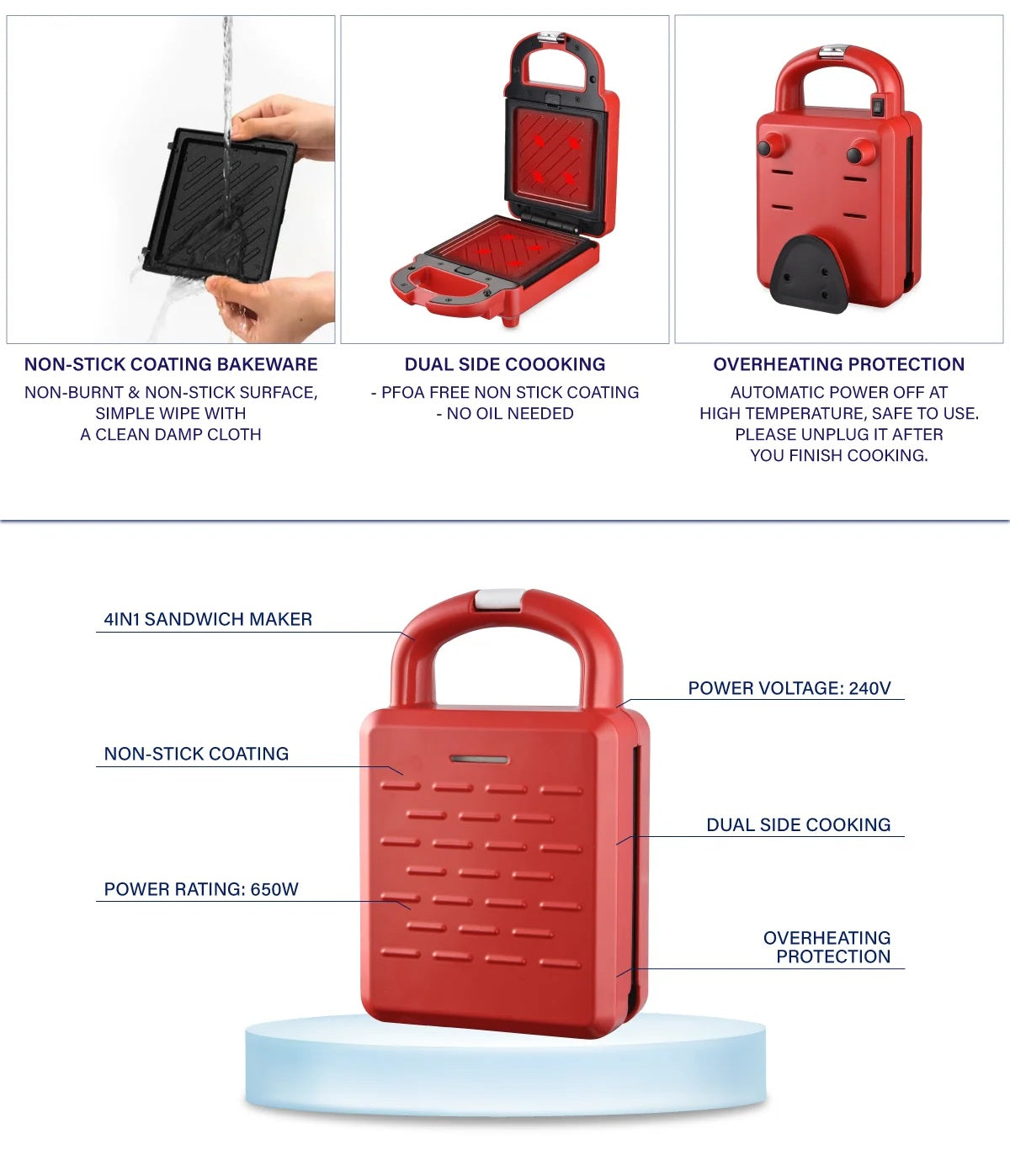 With a rated power of 650W, this waffle and sandwich maker ensures quick and efficient heating, saving you time in the kitchen. The upper and lower plates heat the food simultaneously, ensuring even and fast cooking on both sides. This feature is particularly useful when preparing multiple items, as it allows you to cook food quickly and efficiently.