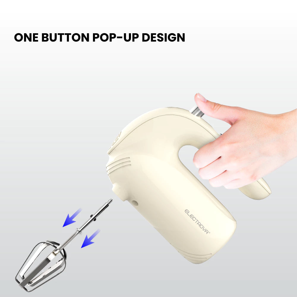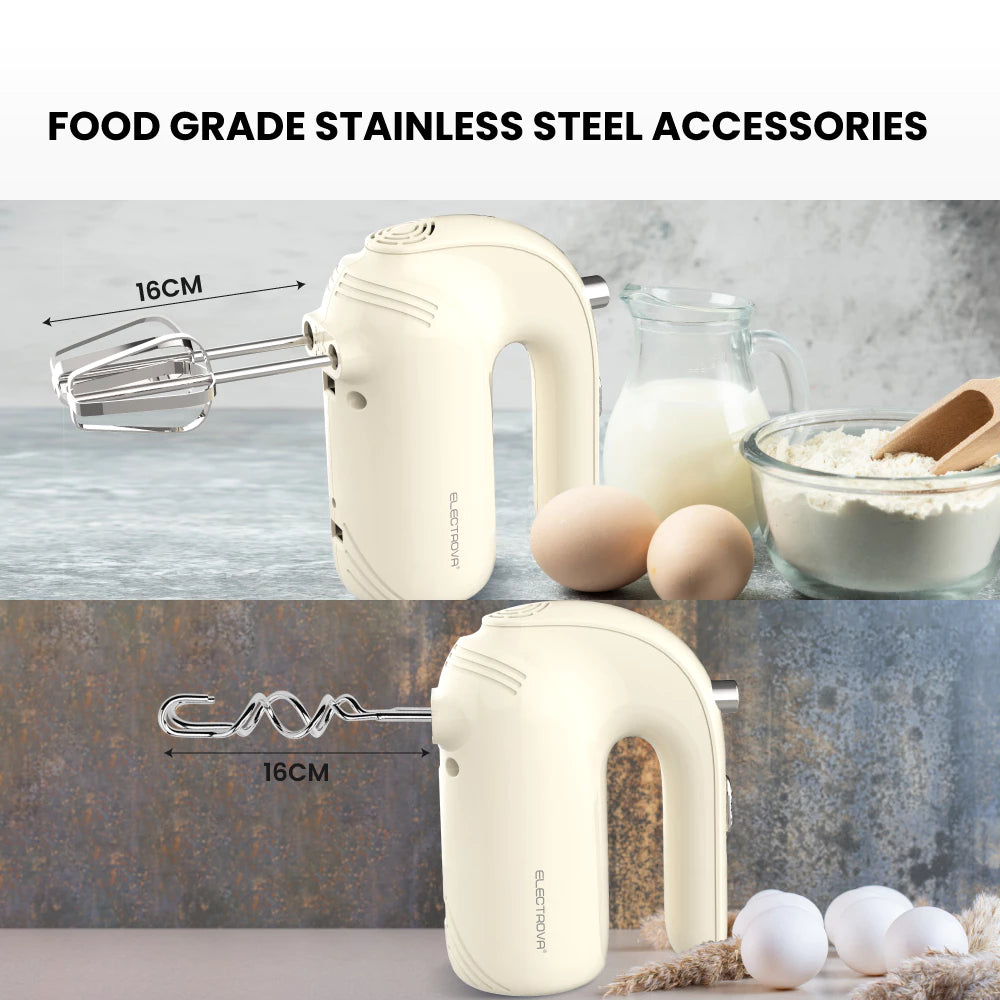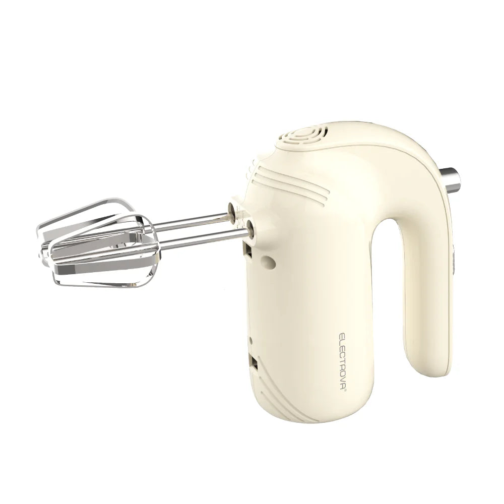 With its small and lightweight BPA-free plastic body, the Electrova Electric hand mixer is easy to handle and store. The mixer's stainless steel decoration and comfortable human-designed handle add an element of style and practicality to your kitchen. Perfect for adding a pop of color, this mixer is a must-have for anyone looking for a reliable and versatile kitchen tool that won't take up too much space.