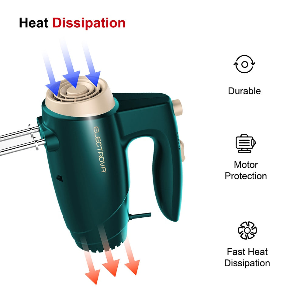 Equipped with a visualized heat dissipation window, this hand mixer prevents the motor from overheating during use, allowing it to cool down and operate at a lower noise level. This unique feature enhances the longevity and overall performance of the mixer, ensuring that it can handle all of your mixing needs. Plus, the reduced noise level makes it a more pleasant kitchen tool to use.