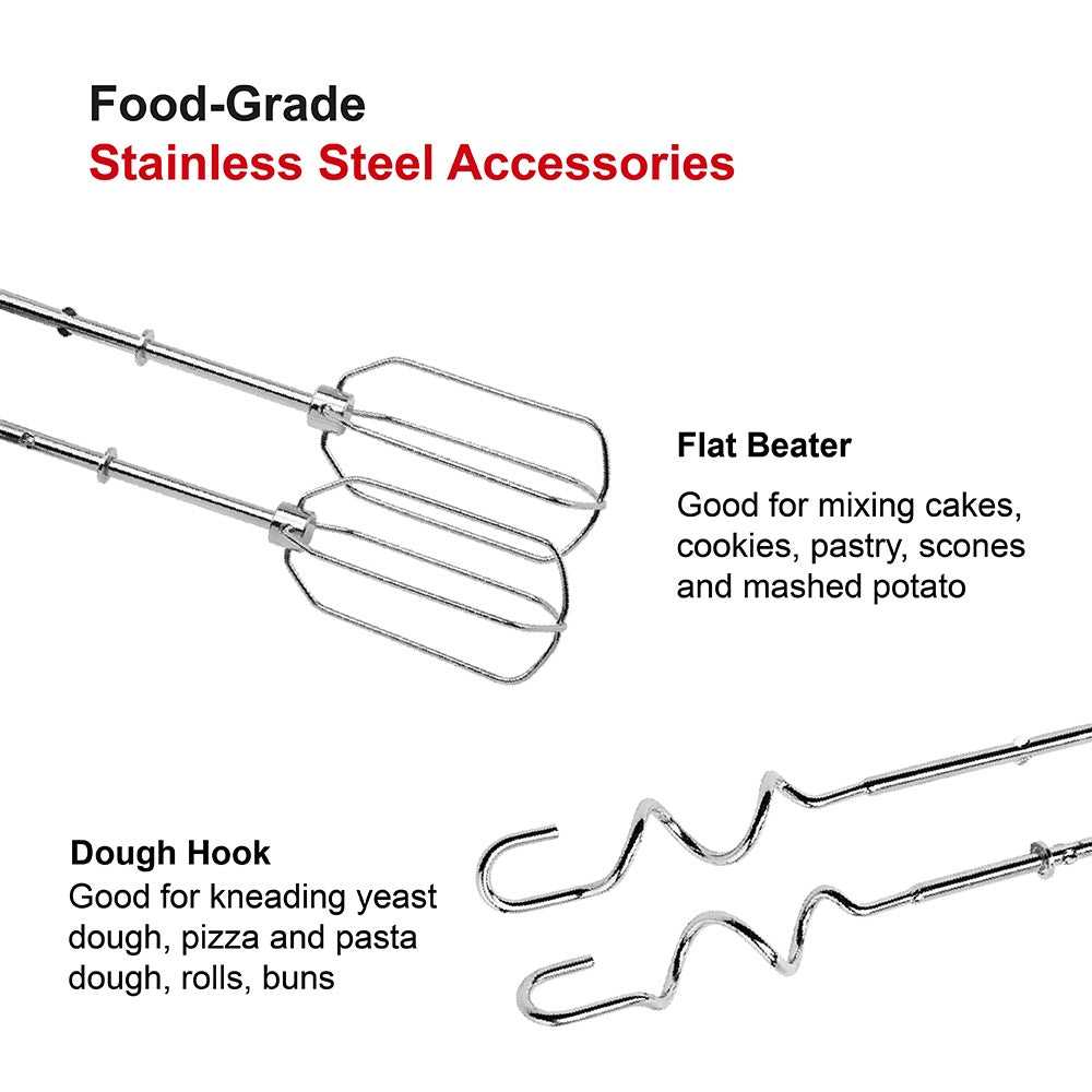 Featuring a pair of durable stainless steel beaters and dough hooks, this mixer's accessories are resistant to rust and built to last. Additionally, their dishwasher-safe design makes cleaning up a breeze. With its reliable accessories, this mixer is an essential tool for any home baker who wants to create delicious treats with ease.