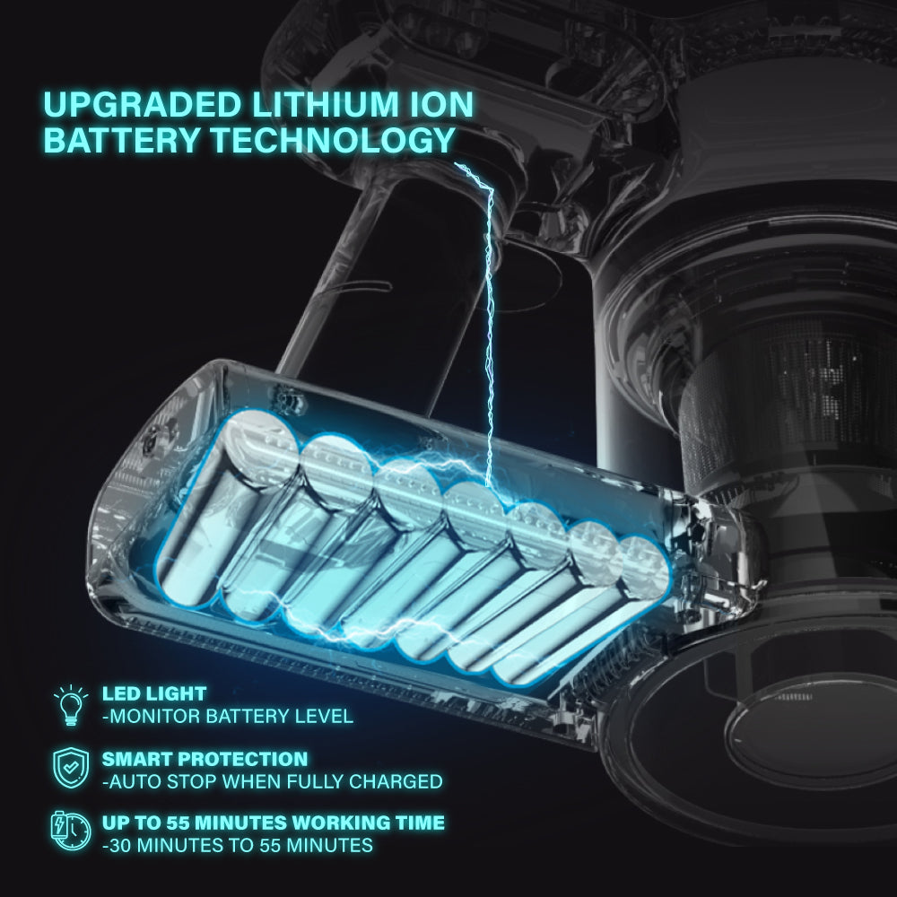iTech Li-ion Battery is upgraded from 24.0V to 25.9V which can last up to 55 mins max using time. With a fully charged iTech Li-ion battery we manage to clean 2 condo in one time. The iTech Li-ion has a smart protection features that will auto cut-off charging when the battery is full.