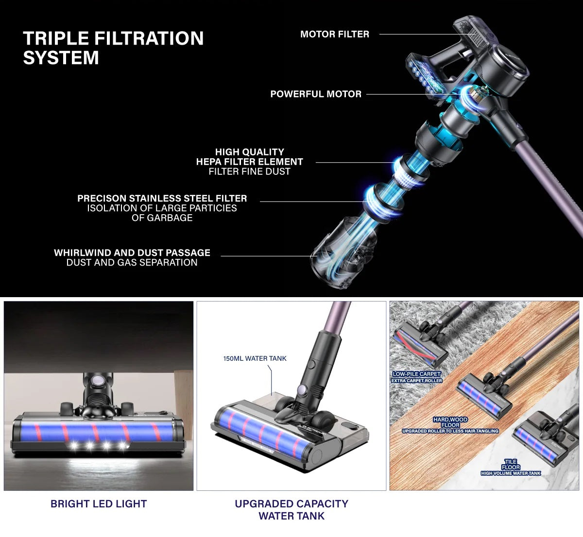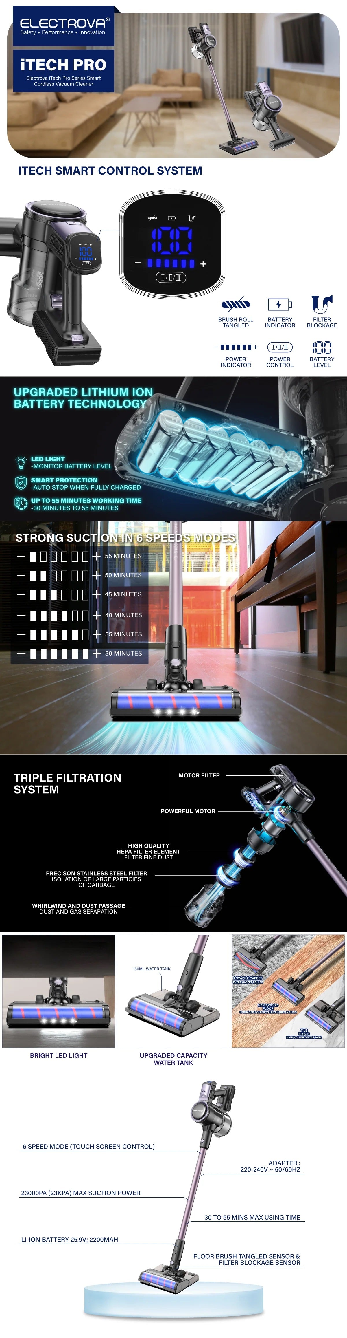iTech Motor which is fine-tuned by the Electrova engineers to perform up to 23000pa suction power.