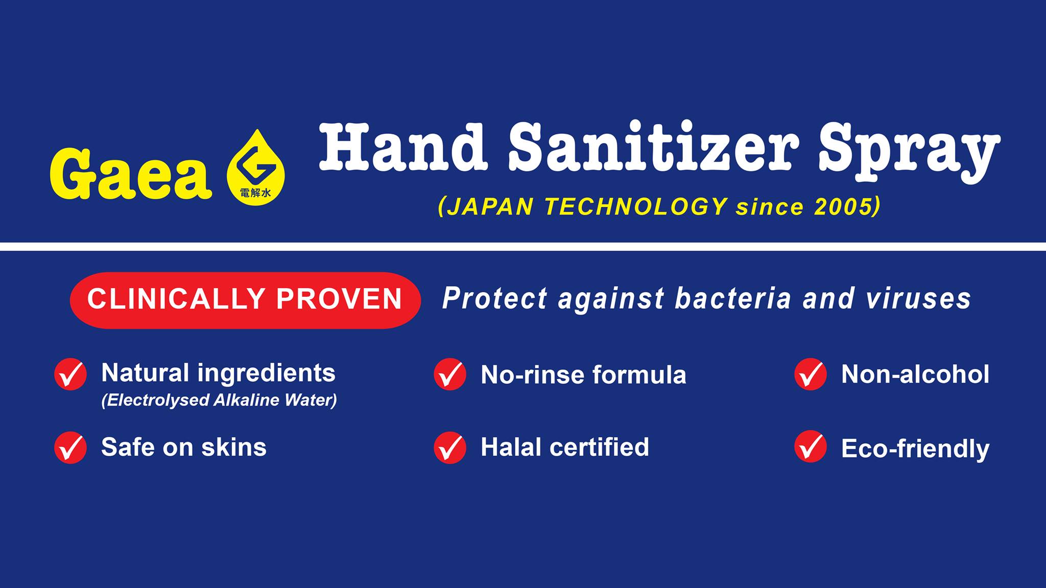 GAEA Water is produced by innovative alkaline electrolytic water generation technology. It's the world first one-side spout system. It does not discharge any acidic solution to the environment. The pH of GAEA Water is high enough to clean, degrease, sanitize, and deodorize objects while it is non-corrosive and safe to human and the environment. It contains no harmful chemicals, no alcohols, no chlorine, no surfactants, colorless and odorless.