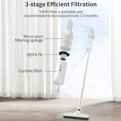 3-layer efficient filtration: HEPA F8 filter (environmentally friendly and washable), cyclone filter, micro-pore filtering sponge.