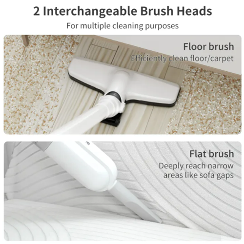 2 interchangeable brush heads for different cleaning scenarios: floor brush for floor/carpet cleaning, flat brush for narrow gaps.
